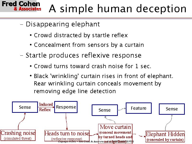 In this case, we can see that this magic trick is easily explained by the cognitive model with deceptions. The metrics in this trick are determined by limits on human reflexes and characteristics of human vision systems. Such deceptions can achieve very high degrees of reliability for substantial sized crowds.