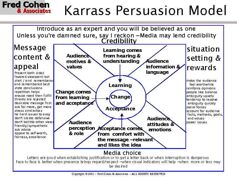 This is a picture of the persuasion model created by Karras as part of his graduate work in the 1960s in negotiations. It forms the heart of the famous Karras negotiations seminars but is also shows many of the results of substantial studies done by Karras of the persuasion process. Since the deception process is seen as persuading a person to change their C3 and the Karras model of persuasion deals with the mechanisms of achieving such a change, it appears to be highly relevant to the issues at hand.