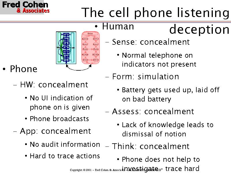 The cell phone listening deception is an example of how the joint human/computer system (in this case the computer is s cell phone) works. The deception runs up the cell phone hierarchy and then through the cellular interface to the human, and up through the human hierarchy. There are branches along the way where the deception can succeed or go to the next level.