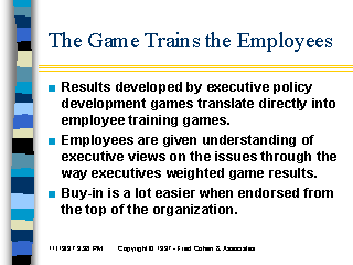Results developed by executive policy development games translate directly into employee training games.