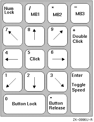 If you don't have a mouse on the system or if you like using the keyboard instead of a mouse in X11, after starting X11, To switch this on/off, press in this order (holding them down until you are done with the third key): Left SHIFT key, left ALT key, NUM-LOCK key. The keypad then works like a mouse, with the arrow keys and corner keys moving the cursor, the middle key acting as a left button tap, the INS key acting as a left button press and hold down, the '.' acting as a button release, enter acting to toggle speed, /, *, and - acting as left, middle, and right mice buttons, and + acting as a double click: