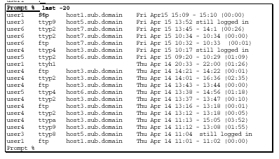 The "last" command displays information about logins and logouts on the system from the /var/adm/wtmp file. If you can determine the username the intruder used to log in, this command can show you how long the intruder was logged in and where they logged in from. The command’s "-n" parameter is used to display the last n entries in the /var/adm/wtmp file.