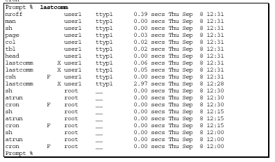 The "lastcomm" command displays the last commands executed. This command is only available if you have process accounting turned on. With this command, you can see every command issued by anyone on the system. A sample output is shown here.