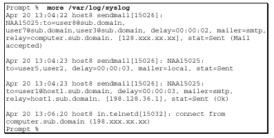 Since this file saves data on incoming as well as outgoing information, especially sendmail information, one of the things to look for is outbound E-mail to suspicious hosts. This may indicate that an intruder sent out information from your system to a remote system.