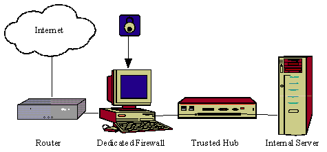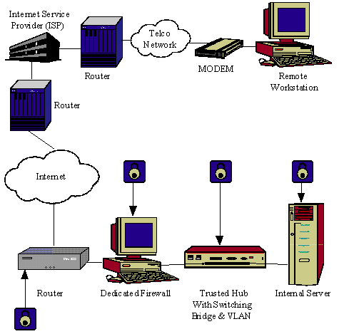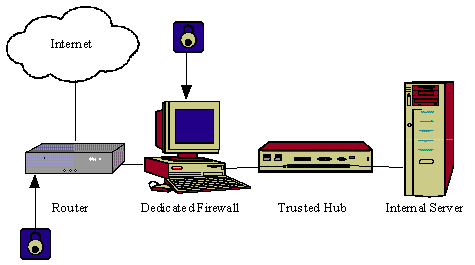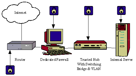 As an example, system vulnerability to attack is greater when only a firewall is used with no router filters on an Internet connection (the padlock symbol indicates a security layer function).: