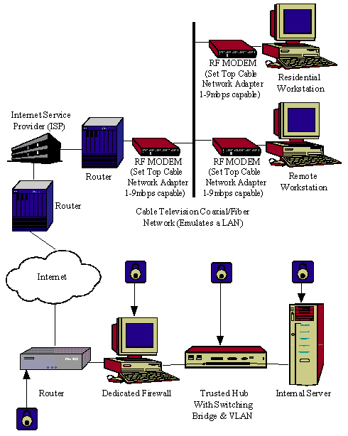 In the very near future (beginning in late 1996), high-speed residential connections will be more and more popular. The author has been directly involved in using a 7mbps connection from his home to the Internet for $19.95 per month via the local cable television network. This connection "looks" like a standard Ethernet connection (it even provides a standard RJ45 UTP connection on the set-top box connection to the cable broadband network) and even works like one with the client software. It also means that it was a trivial matter for the author to load up protocol analysis software on his workstation client and see, quite literally, activity on the cable television network by other persons in the neighborhood including Internet Service Provider (ISP) passwords by other users, files being transferred and popular locations that other neighbors access on the network. Therefore, there is basically NO security when all traffic can be seen in the clear on the network by nodes using the network.