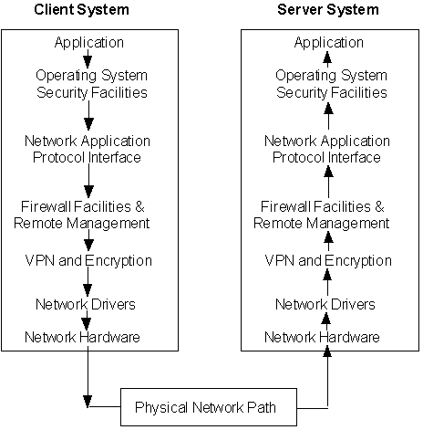 There are situations where using network security firewall software on an active client or server system acts as another security layer in the implementation of a layered network security architecture. This concept, while functionally similar in implementation to the shared system-firewall concepts previously explored, is not the same from a security rule base situation and from a performance situation. Further, this concept is different in that the security threat is lesser in this configuration as it is predisposed that there is a real firewall in the network path BEFORE the system being accessed (running network security firewall software) that has pre-screened connection facilities coming towards the client or server. Adding server-based network security firewall software allows a final layer of network security prior to reaching the server operating environment: