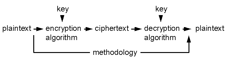 The methodology first applies the encryption algorithm and key to the plaintext to produce ciphertext. The ciphertext is transmitted to a destination where the same algorithm is used to decrypt it to produce the plaintext. The procedure (included in the methodology) to support key creation and distribution is not shown in the diagram.