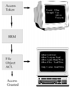 This process and token information together form a subject. When a user requests access to an object, the contents of the subject’s token are compared to the object’s ACL through an access validation procedure. This access validation procedure grants or denies permission to the user’s request.