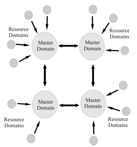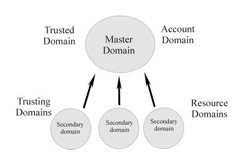 Administration of user accounts and resources are in separate domains. Resources are managed locally on the trusting domains, while user accounts are controlled on the trusted master domain. The master domain model is used in organizations with less than 10,000 users. The number of
