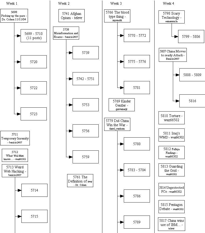 | eemannucla (Riley) | China information warfare article | This was my first post to the forum and was intended to somewhat introduce myself to the forum, and to put Dr. Cohen's article out in the open in order to lay some kind of foundation for our attack. Response: There were no direct responses to this post, but it gave other group members a platofrm to post more on China, and acted as more of a transitioning post so that the China topic didn't just seem to drop out of the blue. | General: iwar forum | This post was fishing for any responses, and employing Greene's 8th law: "When you force the other person to act, you are the one in control. It is always better to make your opponent come to you, abandoning his own plans in the process". |