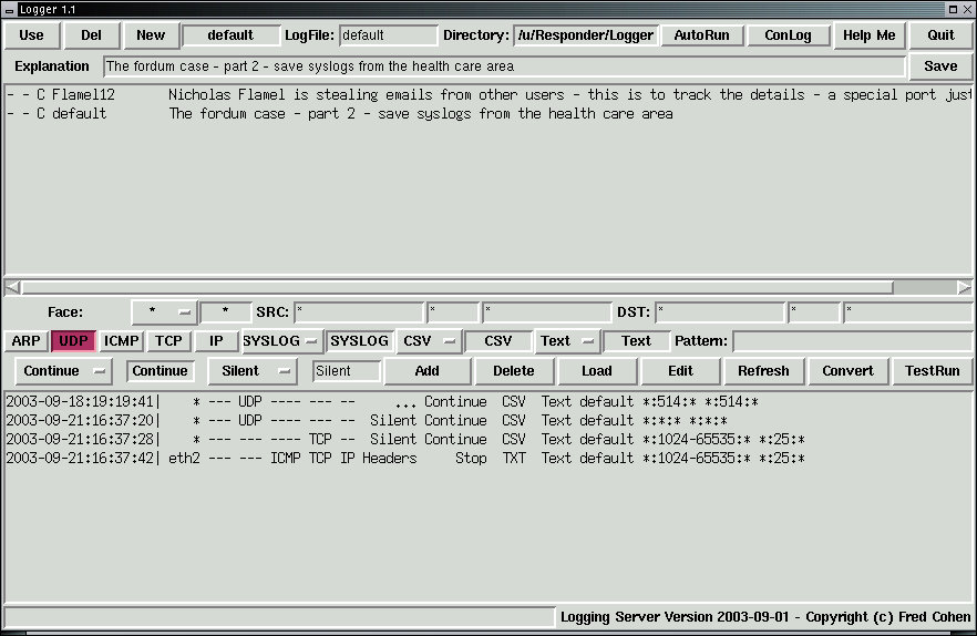 Another important useful part of the Logger is that it can do many functions at the same time. For example, keeping copies of all SYSLOG traffic might be done all of the time as a backup to critical log files. At the same time, the Logger might keep copies of all of the transaction traffic associated with a transaction server so that in case of a failure the data can be replayed. While these two functions are underway, the Logger might also be configured to collect data from one or more investigations of specific behaviors by specific users. And even as this is underway, it can be used to debug network connectivity and look for traffic that doesn't belong in the network. All of these can be done at the same time, each viewing and collecting only what it needs to do its job.