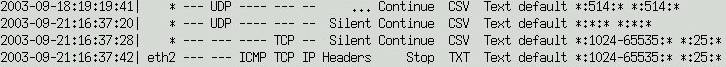 Console output: When you run the logger, console output can be generated in the logger window. Selections include: (1) Silent for no output, (2) Headers for lists of headers of triggered logging events, (3) Details, for details about packets including the first several bytes of TCP and UDP content, (4) '...', produces a single '.' for each time this rule produces a log output, or the user can specify a different character or character sequence that will be printed each time a log is generated. This is handy for cases when different rules generate different output chartacters to allow the user to track how many of what are hapenning how quickly. Output can be redirected to a file for additional logging of the logger activites if desired, and silence can be used througout if logging is configured for automatic restart on power outage or reboot.