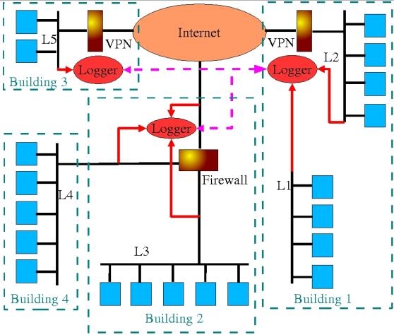 Figure 2 shows typical placement and applications for the Logging and Sniffing Server. This figure depics an enterprise with 4 buildings, 5 Local Area Networks(LANs) L1, L2, L3, L4, and L5, hosts on those LANs, Virtual Private Network (VPN) between some of those LANs, Internet connectivity, a firewall in building 2, and logging servers.