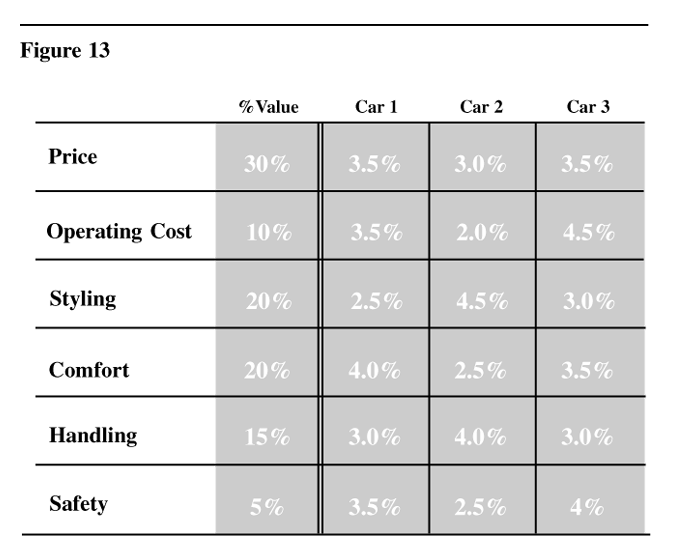 You now have a picture of your analytical problem--the comparative value you attribute to each of the principal attributes of a new car and a comparison of how various cars satisfy those desired attributes. If you have narrowed it down to three alternatives, your matrix will look something like Figure 13: