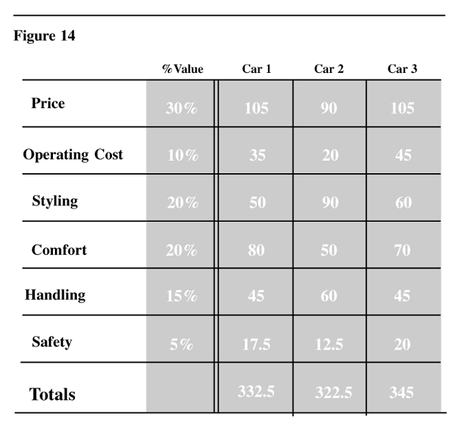 When all the cells of the matrix have been filled in, you can then calculate which car best suits your preferences. Multiply the percentage value you assigned to each attribute by the value you assigned to that attribute for each car, which produces the result in Figure 14. If the percentage values you assigned to each attribute accurately reflect your preferences, and if each car has been analyzed accurately, the analysis shows you will gain more satisfaction from the purchase of Car 3 than either of the alternatives.