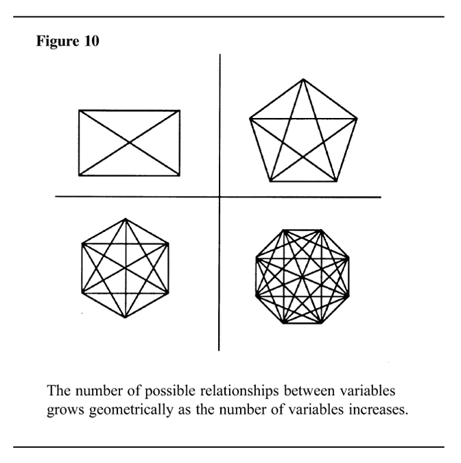The number of possible relationships between variables grows geometrically as the number of variables increases.