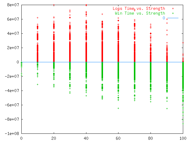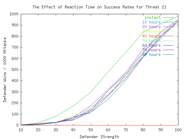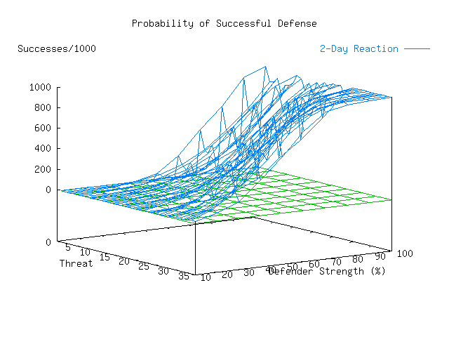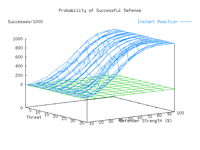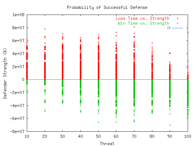 Clearly, we cannot evaluate the results from such runs on a piecemeal basis because of the role that luck may play in attack and defense. Rather, because we cannot accurately measure the situations to the point of being able to be predictive on a case by case basis, we must consider them in the aggregate in order to derive meaningful results. If we think in these terms, it should be clear that a 10 percent difference in the value of the threshold used at any given point in a run will produce a 10 percent change in the number of times there is a success or failure at that point in the simulation. If a particular value is used repeatedly, the effect will accumulate in that run. The net effect will be a time difference in the outcomes of the runs, or in the case where detection and reaction are taken into consideration, an increase or decrease in the wins or losses. Since there are many such events in a typical run, each of which could have an effect in either direction, random errors tend to cancel while correlated errors tend to compliment each other. This is what we see, for example, in the analysis of defender strength and reaction time for the large numbers of sample runs shown in Plates 3 and 6.