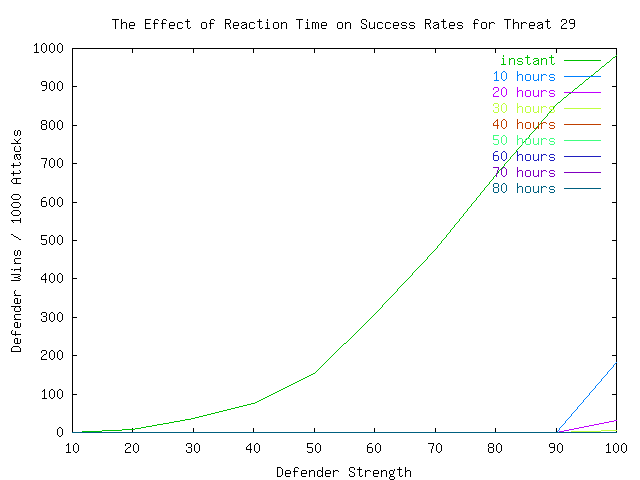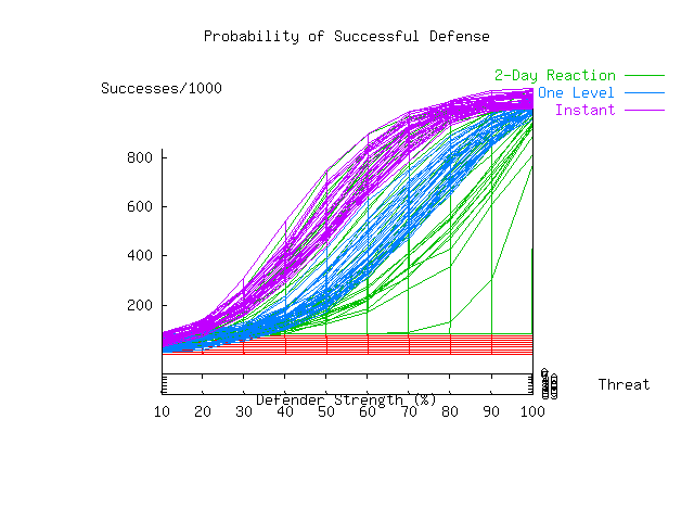 Perhaps the most interesting results here are the shapes of the outcome curves over time and the association of this phenomena with the high degree of time gradation between different attack methods. This result has many implications and, while it may seem almost obvious once it is presented, it was unpublished and not known to the author until simulations revealed it, and it was a surprise until the detailed simulation results were examined. This has all of the hallmarks of a valid experimental basis for scientific inquiry.