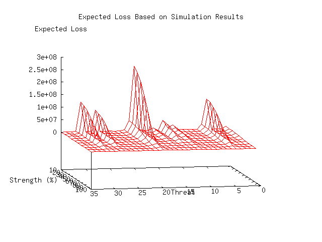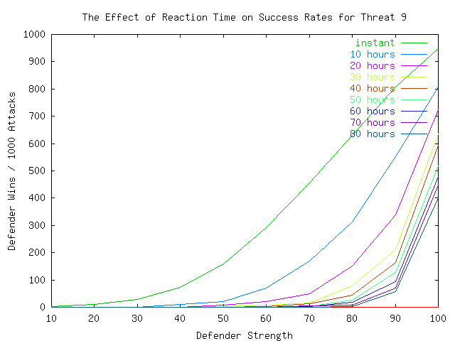 The aggregate results provide us with information on the shapes of the curves, but clearly, sensitivity depends on where you are on these curves. For example, in Plate 11 (Instant Reaction Total Expected Loss vs. Defender Strength) small errors in defender strength near 100 percent make little difference as will small changes at very low defender strength, but changes between 30 percent and 60 percent cover more than a factor of 3 in expected loss. The ability to measure accurately is far more important if we intend to operate in the middle portion of the curve, while the ability to measure is far less important near the minimums and maximums. If we add an equation for defender strength vs. investment defender strength (i.e., via education and skills development) the place where the sum of the cost of defenders and the expected loss are minimized provides the optimum for costs of training vs. expected loss, and the sensitivity around that point is the issue that has to be settled to better optimize this investment.
