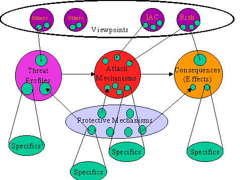 In the end, we chose a model of our own devising. (see Plate 1) The key issue underlying this decision was the notion that we need a basis for a cause-effect analysis of chains of events that can be overlaid on the architecture of an information environment. Once we have a model of cause and effect, we can begin to try to simulate, with the notion of time naturally falling out of the delay between cause and effect. The model we developed [Cohen98] was designed for the purpose of simulation and analysis and has been the subject of considerable research. It is based on a set of 37 classes of threats, 94 classes of attack mechanisms, and about 140 classes of protective mechanisms. These are interlinked by a database which associates threats with attacks and attacks with defenses. In addition, the database associates threats, attack methods and defense methods with other characteristics such as their impact on integrity, availability, access, and leakage; the sophistication level of the attackers; and their use in prevention, detection, and reaction.