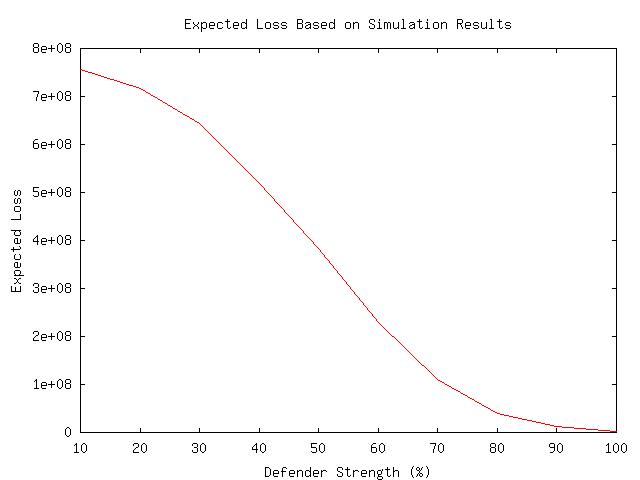 If we add in detailed defender costs, this picture changes rather interestingly. It turns out that the cost of increasing the quality of defenders goes up rather steeply as we approach perfection, while going from little expertise to fairly good expertise is far less expensive. With the right education, for ten to twenty thousand dollars per defender, we can go from a defender of strength 10% to a defender of strength 60% to 70%. For another twenty thousand dollars, we may be able to get to strength 80%, but getting to 100% is essentially impossible at any price. For the curve above, this would seem to indicate that we should spend about thirty thousand dollars per year to train security specialists (assuming they are systems administrators and have other expertise already). If we spend much more, it will likely not be worth the cost, while spending less is probably inadequate. Of course this depends heavily on the quality of the training you get for the cost and many other factors. Again, these results are not prescriptive for other cases, but they do seem to demonstrate that the technique is effective in that it is able to produce prescriptive results given reasonably accurate data.
