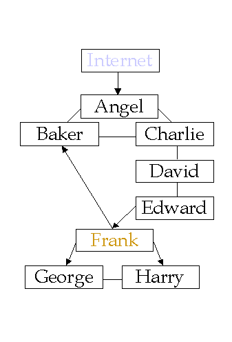 For the purposes of the simulation runs we describe throughout this paper, the following diagram characterises the network. In this diagram, arrows indicate uni-directional information flow. Named nodes are linked with lines and defenses in each node are as specified in the listing.